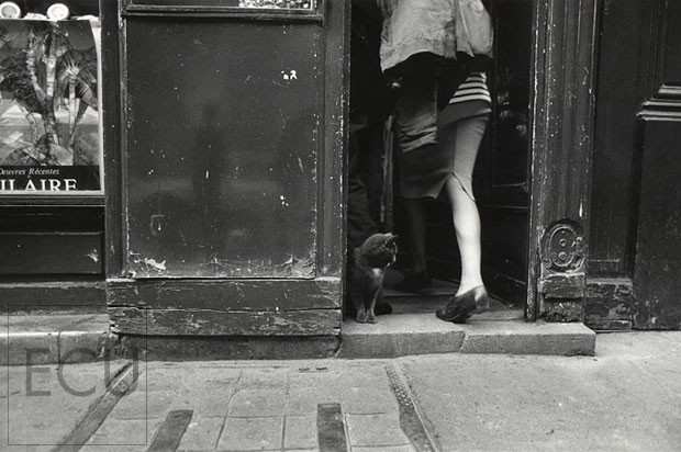 Black and white photo of a cat at Dacha des Arts café on Rue St. Andre-des-Arts in the Left Bank, 6th arrodisement, Paris, France