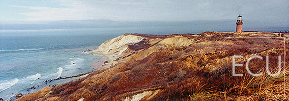 Color photo of Martha's Vineyard in Massachusetts showing the Gay Head section with lighthouse and Atlantic Ocean